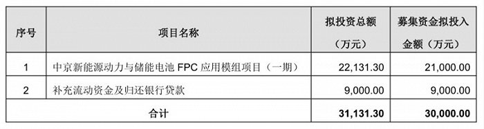 新的发行预案显示,在本次发行股票所募集的3亿元之中,2.10亿元拟投入动力与储能电池FPC应用模组项目(占比70%),另外的30%资金(9000万元)拟用于补充流动资金及归还银行贷款。相比于2023年的定向增发股票方案,本次发行的募资总额从8亿元缩减至3亿元,募投项目基本一致(划分为“一期”),但是拟投入资金规模出现大幅缩减。