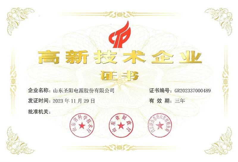 近日,经山东省科学技术厅、山东省财政厅、国家税务总局山东省税务局三部门联合认定,经全国高新技术企业认定管理工作领导小组办公室核准,圣阳股份再获“国家高新技术企业”称号(证书编号GR202337000489)。圣阳股份自2008年第一次获得高新技术企业,截止2023年已连续第6次通过认定。