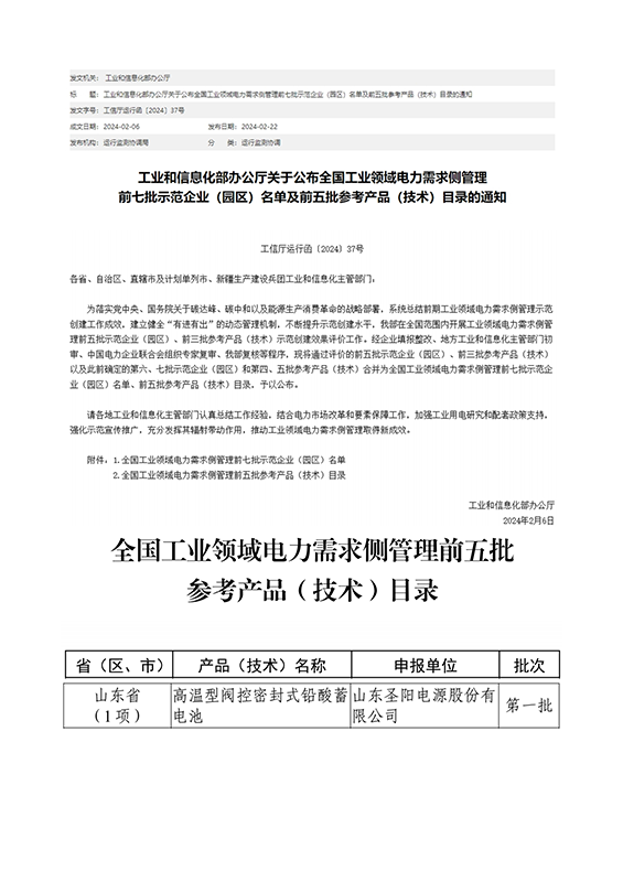 近日,国家工业和信息化部办公厅发布《全国工业领域电力需求侧管理前七批示范企业(园区)名单》和《全国工业领域电力需求侧管理前五批参考产品(技术)目录》,圣阳股份高温型阀控密封式铅酸蓄电池列入全国工业领域电力需求侧管理第一批参考产品(技术)目录。