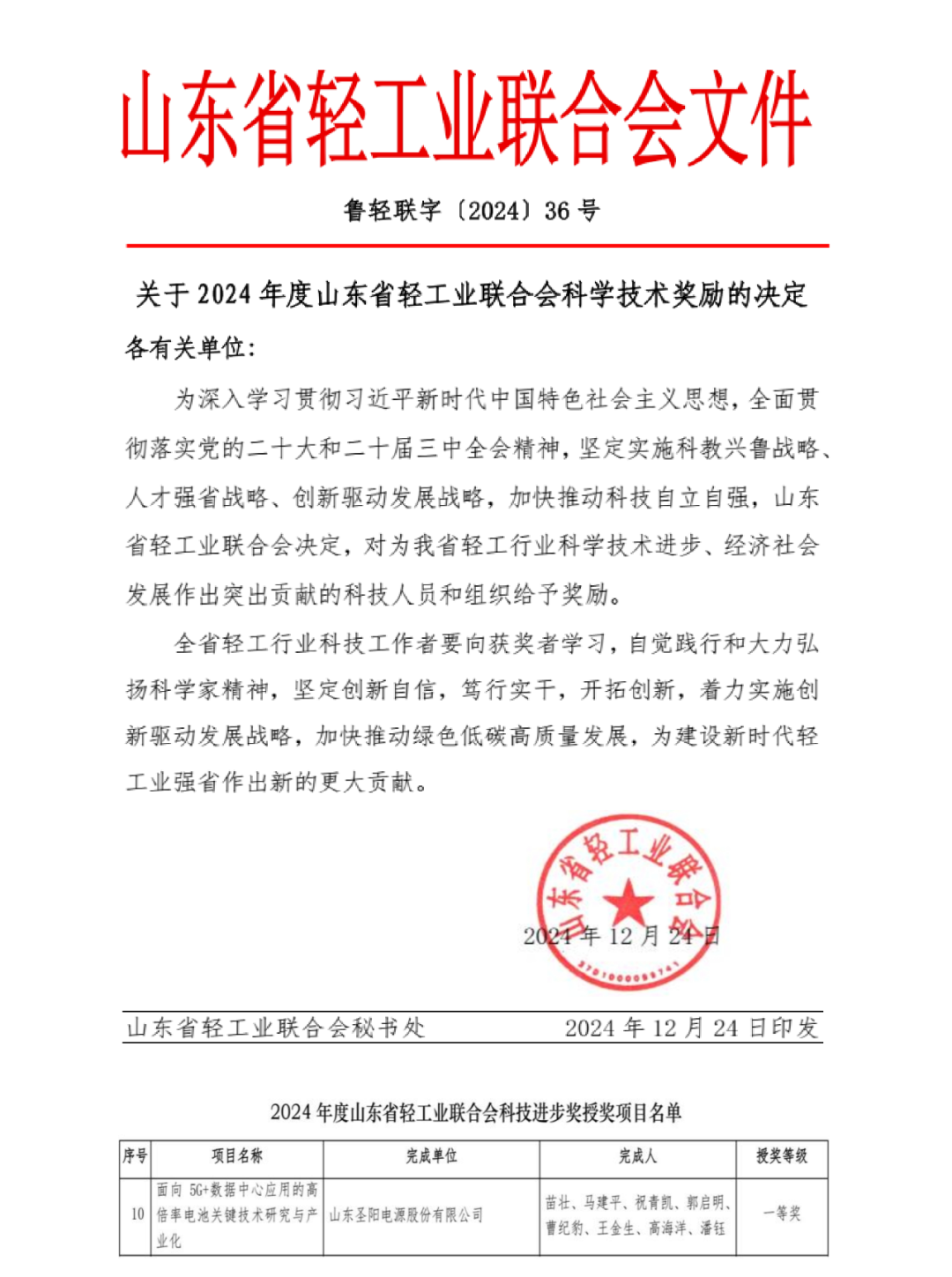 近日,山东省轻工业联合会发布《关于2024年度山东省轻工业联合会科学技术奖励的决定》,圣阳股份申报的“面向5G+数据中心应用的高倍率电池关键技术研究与产业”项目荣获科技进步奖一等奖。