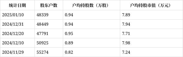 从1月15日公开信息显示,圣阳股份截至2025年1月10日公司股东户数为4.83万户,较上期(2024年12月31日)减少110户,降幅为0.23%,变化不大。
