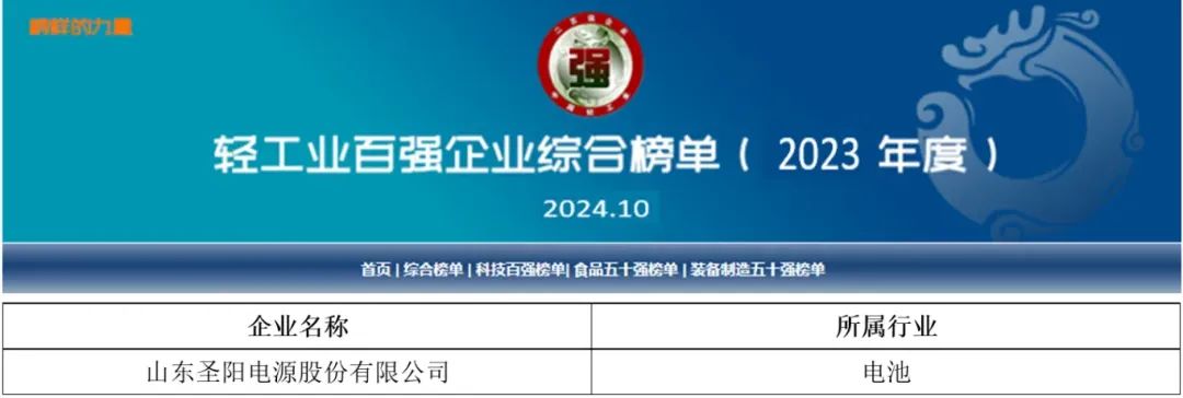 近日,根据中国轻工业联合会的评价结果,圣阳股份入选中国轻工业百强企业榜单。