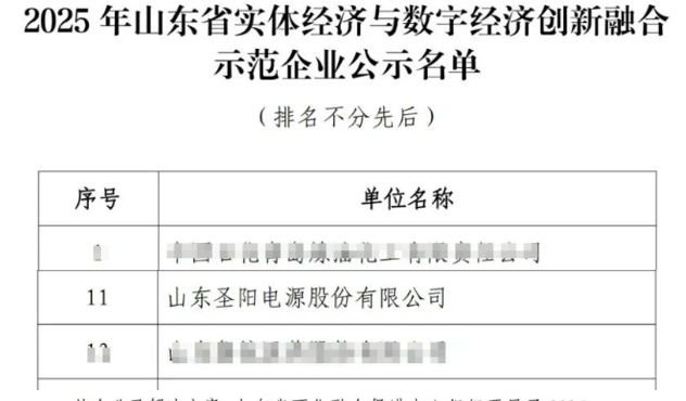 近日,山东省两化融合促进中心公布2025实数融合创新发展奖项评选结果,山东发展集团旗下圣阳股份凭借突出的数字化转型成效,成功获评 2025年山东省实体经济与数字经济创新融合示范企业称号。