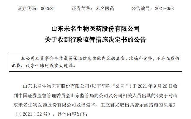2021年9月27日,未名医药发布《关于收到行政监管措施决定书的公告》,该公司违反了《上市公司信息披露管理办法》(证监会令第40号)第二条、第四十八条的规定,公司董事长潘爱华、时任董秘王立君违反了《上市公司信息披露管理办法》(证监会令第40号)第三条的规定。按照《上市公司信息披露管理办法》(证监会令第40号)第五十八条、五十九条的规定,证监会山东监管局决定对未名医药及潘爱华、王立君采取出具警示函的措施,并将相关情况记入证券期货市场诚信档案数据库。