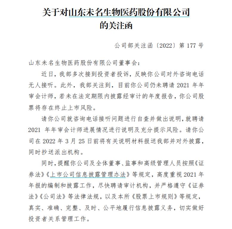 3月21日晚间,未名医药公告称,收到深交所下发的关注函。深交所表示,近日,上市公司管理二部多次接到投资者投诉,反映公司对外咨询电话无人接听。此外,目前公司仍未聘请2021年年审会计师,若未在法定期限内披露经审计的年度报告,公司股票将存在终止上市风险。