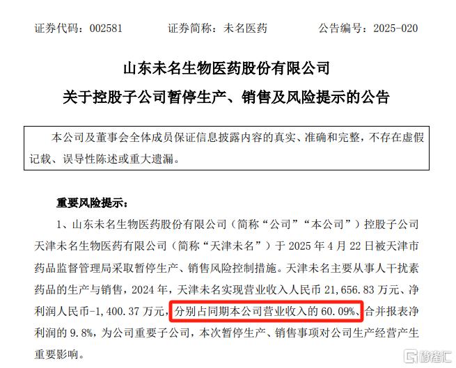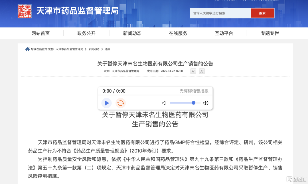 4月24日晚间,未名医药连发公告披露,天津市药监局在药品GMP符合性检查中发现天津未名(下称“天津未名”)存在严重生产管理缺陷,决定对其采取暂停生产、销售的风险控制措施。
