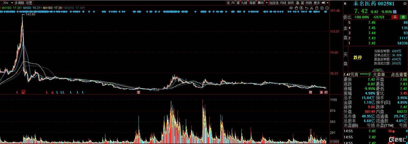消息影响下,未名医药今日开盘便大幅跳水低开后火速跌停,截至收盘,报7.42元/股,跌停板最高封单额超4392万元,总市值48.95亿元。