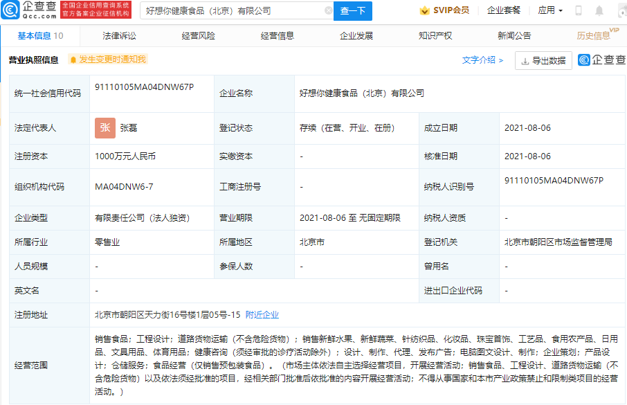 企查查APP显示,8月6日,好想你健康食品(北京)有限公司成立,法定代表人为张磊,注册资本1000万元人民币,经营范围包含:电脑图文设计、制作;企业策划;产品设计;仓储服务;食品经营等。