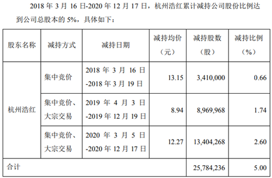 2021年以来,杭州浩红继续减持,2月23日到6月28日,减持了1.73%的股份,持股比例下降到7.45%。
