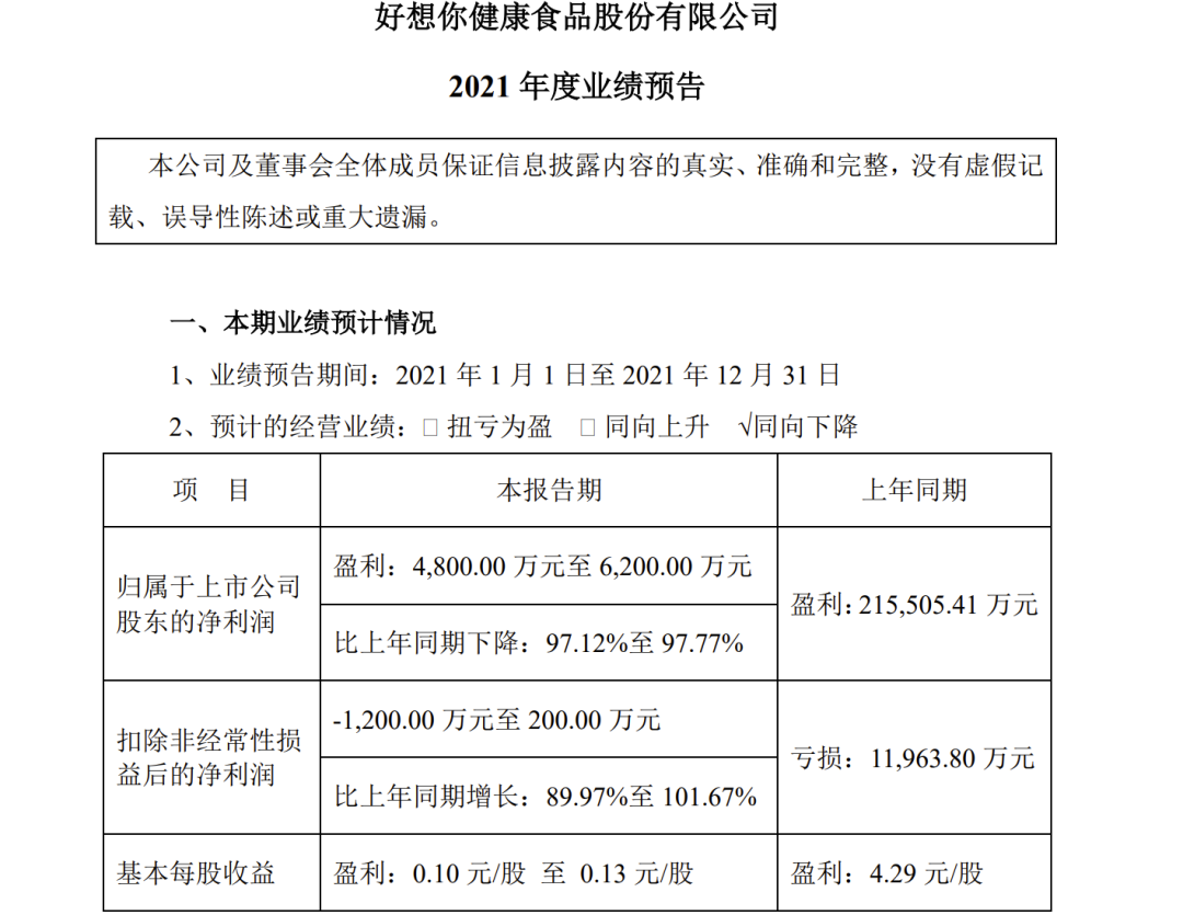 1月29日,“红枣第一股”好想你健康食品股份有限公司(下称“好想你”)发布2021年年度业绩预告,预计业绩同向下降。报告期内归属于上市公司股东的净利润4800.00万元至6200.00万元,比上年同期下降97.12%至97.77%;扣非净利润-1200万元至200万元,比上年同期增长89.97%至101.67%。