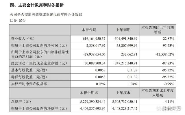 好想你半年报显示,2022年上半年公司实现营业总收入6.16亿元,同比增长22.9%;实现归母净利润236万元,同比下降95.7%;而扣除政府补贴后,在最能体现主业(红枣食品)业绩的扣非净利润这一指标中,财报显示亏损2894万元,与去年同期盈利23.27万元相比大跌12538%。
