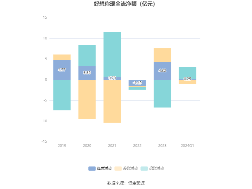 2024年第一季度,公司经营活动现金流净额为2471.24万元,同比下降78.86%;筹资活动现金流净额-1.03亿元,同比减少8678.84万元;投资活动现金流净额2.91亿元,上年同期为5929.48万元。
