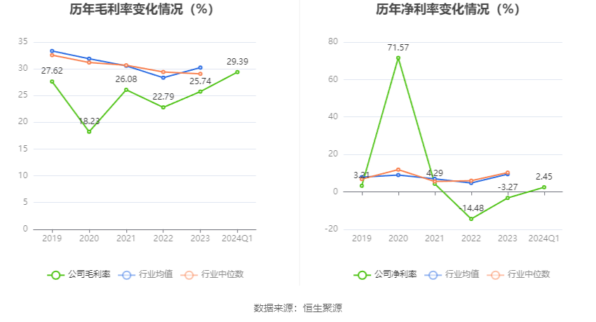 2024年第一季度,公司毛利率为29.39%,同比上升2.68个百分点;净利率为2.45%,较上年同期下降0.29个百分点。