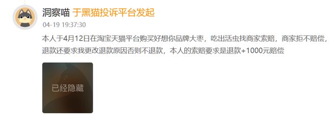 此外,也有其他消费者投诉好想你产品存在异物。今年4月,有消费者称在淘宝天猫平台购买的好想你大枣中吃出活虫,找商家索赔遭拒,商家还要求消费者更改退款原因才予退款。截至目前,该投诉也已完成。