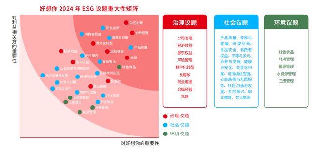 然而,查阅《好想你2024年ESG报告》,在环境议题方面,公司主要聚焦于绿色食品、环境管理、能源管理、水资源管理以及三废管理等议题。尽管与2023年报告相比,其议题分布已与MSCI大致相符,但公司在环境维度的重视程度仍有提升空间。