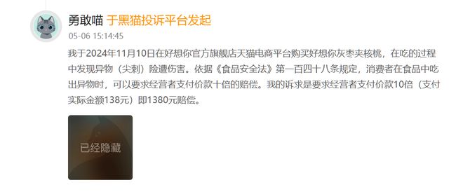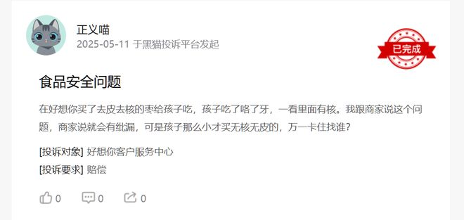 在黑猫投诉平台上,好想你产品也受到不少消费者投诉。今年5月,有消费者在平台上投诉称,其在好想你官方旗舰店购买的灰枣夹核桃中发现异物(尖刺),险些造成伤害。该消费者提出赔偿要求,截至目前,“好想你客户服务中心”已作出回复,该投诉已完成。