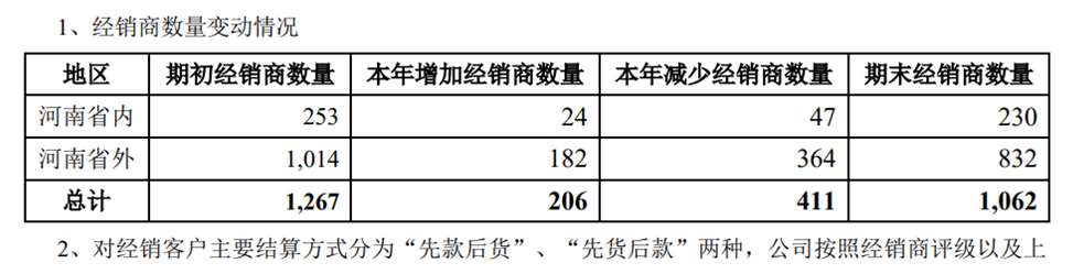 从经销商体系来看,公司全国经销商总数由1267家降至1062家,减少205家,其中河南省外经销商减少364家,省外经销商流失情况严重。经销商数量的减少,意味着公司在省外市场的销售网络不断萎缩,市场覆盖能力进一步下降。