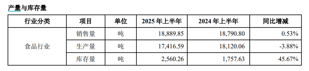 2025年上半年,好想你的食品行业的销售量为18,889.85吨,同比增加了0.53%。生产量为17,416.59吨,同比减少了3.88%。库存量为2,560.26吨,同比增加了45.67%。