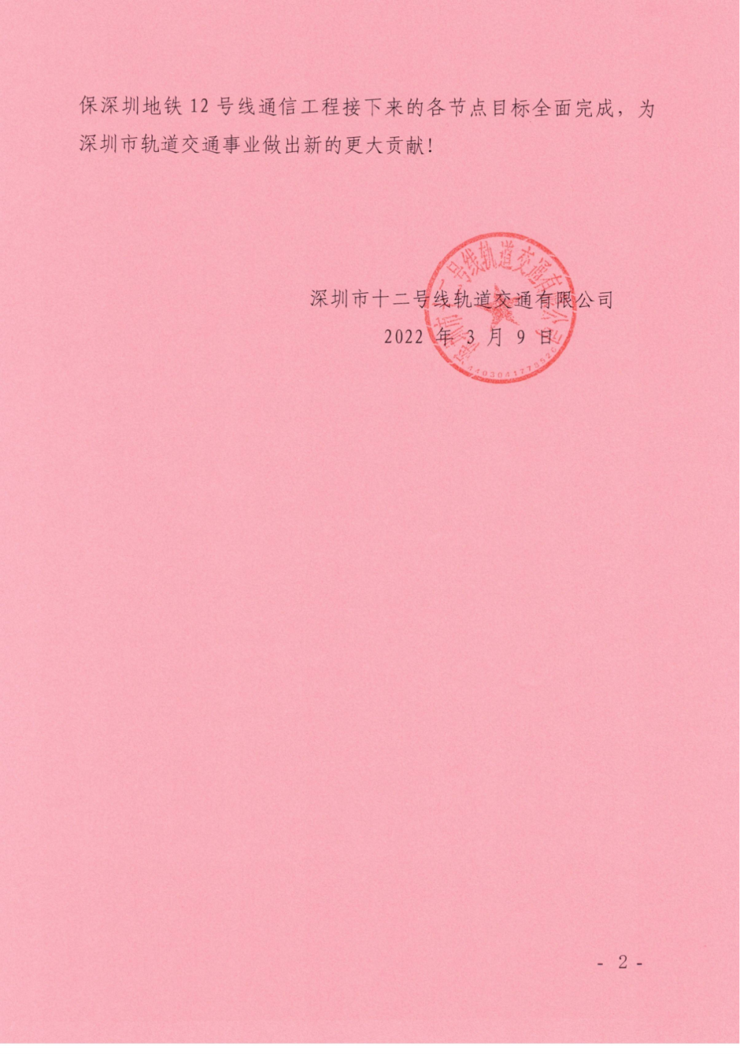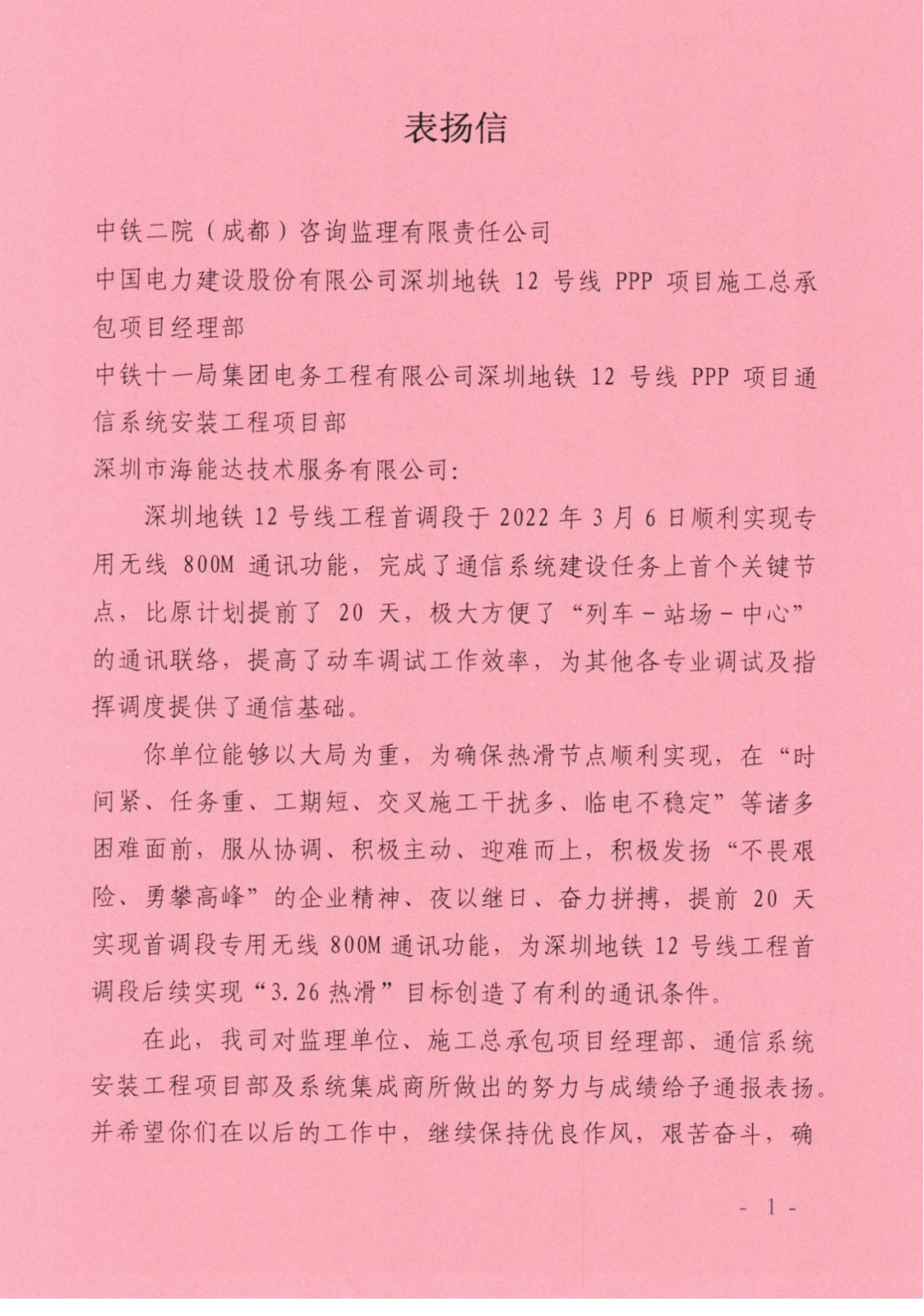 (深圳市地铁12号线轨道交通有限公司表扬信)