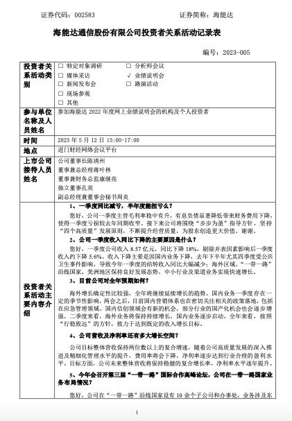 海能达通信股份有限公司(以下简称“海能达”或“公司”)5月14日发布公告称,公司于5月12日举行了2022年度网上业绩说明会。在会议中,海能达透露,过去三年,公司扛住内外部压力,负债率从高位的63%下降至2022年底的45%以下,经营性现金流连续5年保持正向稳定,2022年实现扭亏为盈,迎来经营拐点。2023年公司一季度主营毛利率稳中有升,有息负债显著降低带来财务费用下降,使得一季度亏损较去年同期收窄。