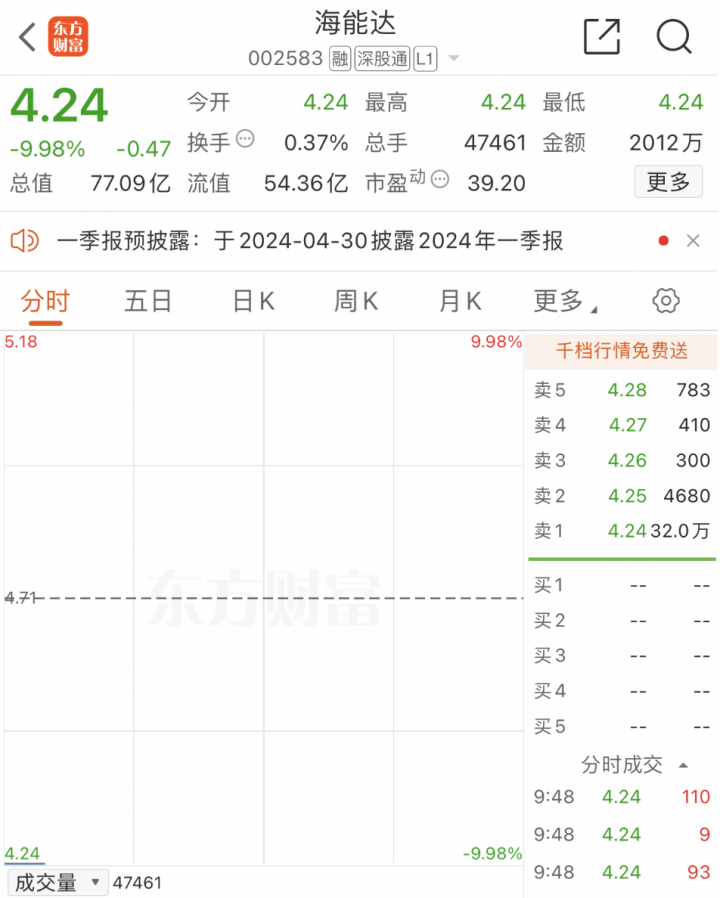 受此影响,今日开盘后,海能达股价直接一字跌停,截至发稿,股价报4.24元,跌停板上的封单达32万手,公司最新总市值缩水至77.09亿元。