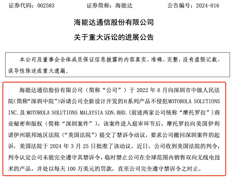 据公告显示,此次事件,起源于海能达与摩托罗拉的商业秘密及版权侵权诉讼案件。
