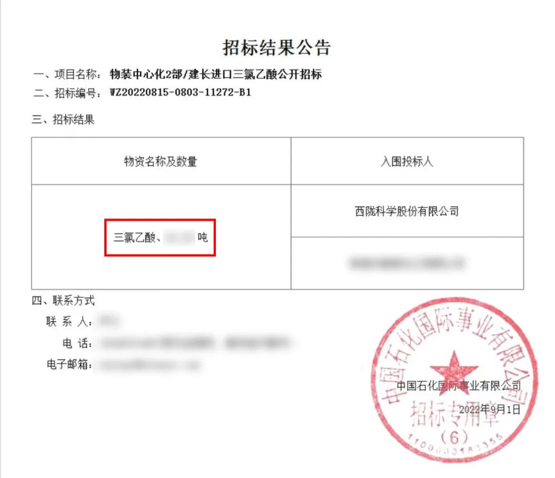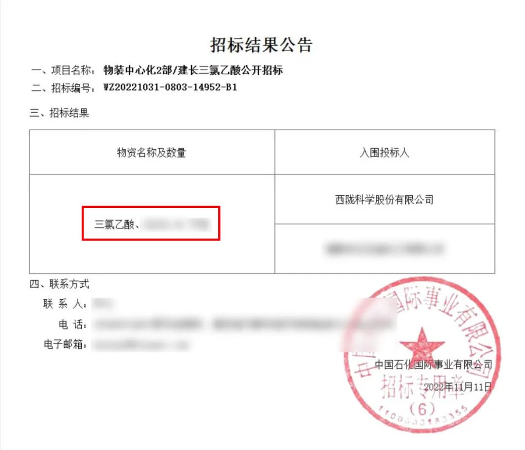 西陇科学三氯乙酸部分招标结果公示(招标网站公示截图)