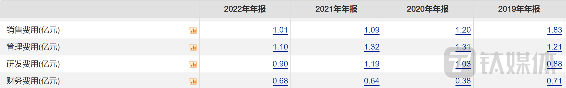 公司营业利润难以提升,也和期间费用过高相关。值得注意的是,2022年公司净利润为8700万,但其中扣非净利润只有0.08亿,而反观公司财务费用、管理费用、研发费用、销售费用平均近1亿。