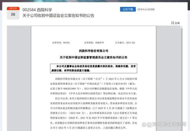 西陇科学股份有限公司(股票简称“西陇科学”,股票代码:002584)于 2023 年 5 月 7日晚发布收到证监会下发的《立案告知书》(编号:证监立案字 0062023005号),因公司涉嫌信息披露违法违规,根据《中华人民共和国证券法》《中华人民共和国行政处罚法》等法律法规,决定对公司立案。