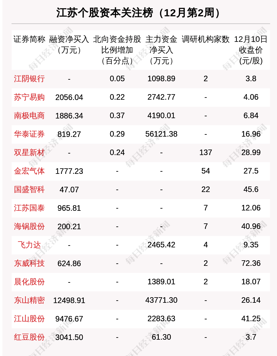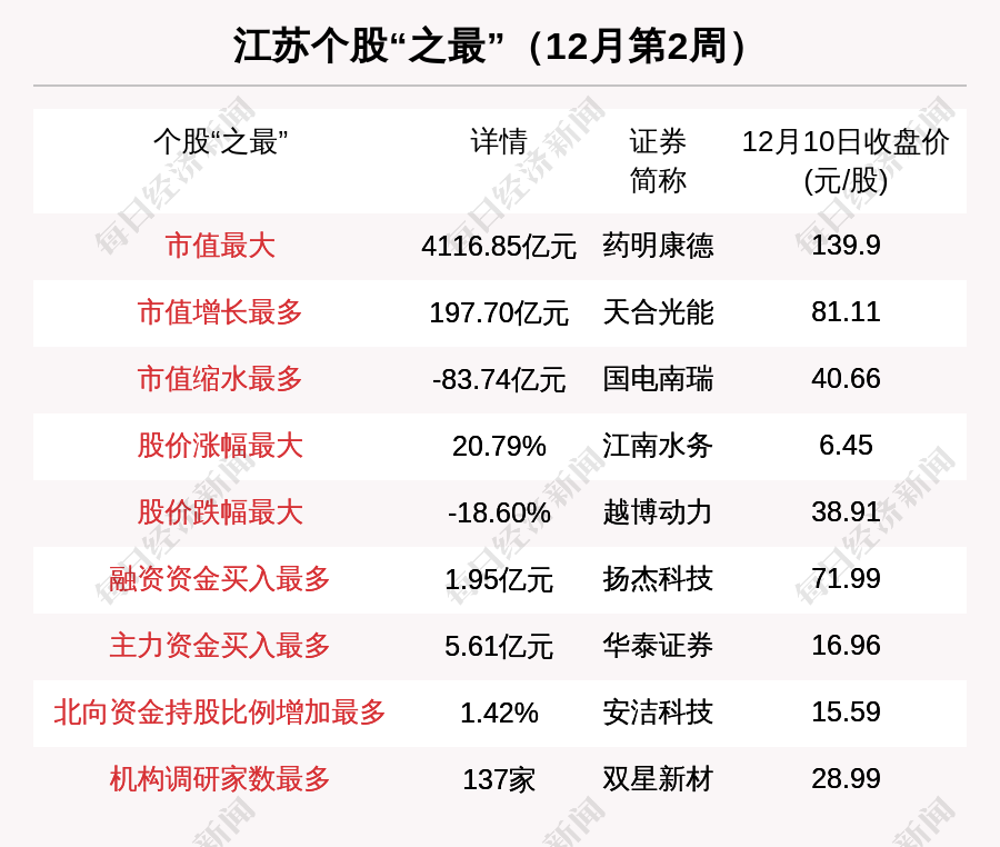 12月第2周(2021年12月6日~2021年12月12日),江苏股中,天合光能市值增长最多;国电南瑞市值缩水最多;涨幅最大的是江南水务,上涨幅度为20.79%;跌幅最大的是越博动力。此外,江阴银行被2家机构调研,且同时被主力资金,北向资金看好。