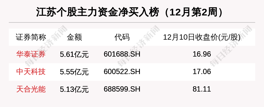 主力资金方面,12月第2周,华泰证券净买入额居首位,为5.61亿元,其次是中天科技(5.55亿元)和天合光能(5.13亿元)。