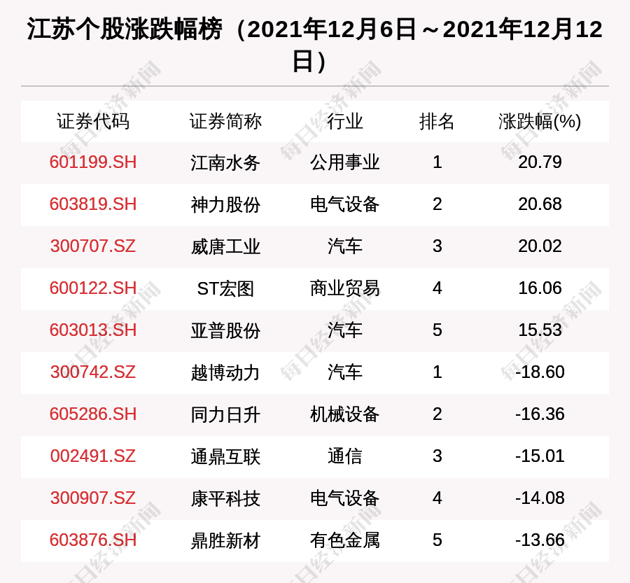从涨跌幅来看,上周涨幅最大的江苏公司是江南水务,上涨幅度为20.79%。跌幅最大的是越博动力,下跌幅度为18.60%。