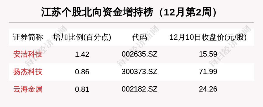 再看北向资金,12月第2周,安洁科技北向资金持股比例增加1.42个百分点,扬杰科技北向资金持股比例增加0.86个百分点,云海金属北向资金持股比例增加0.81个百分点。