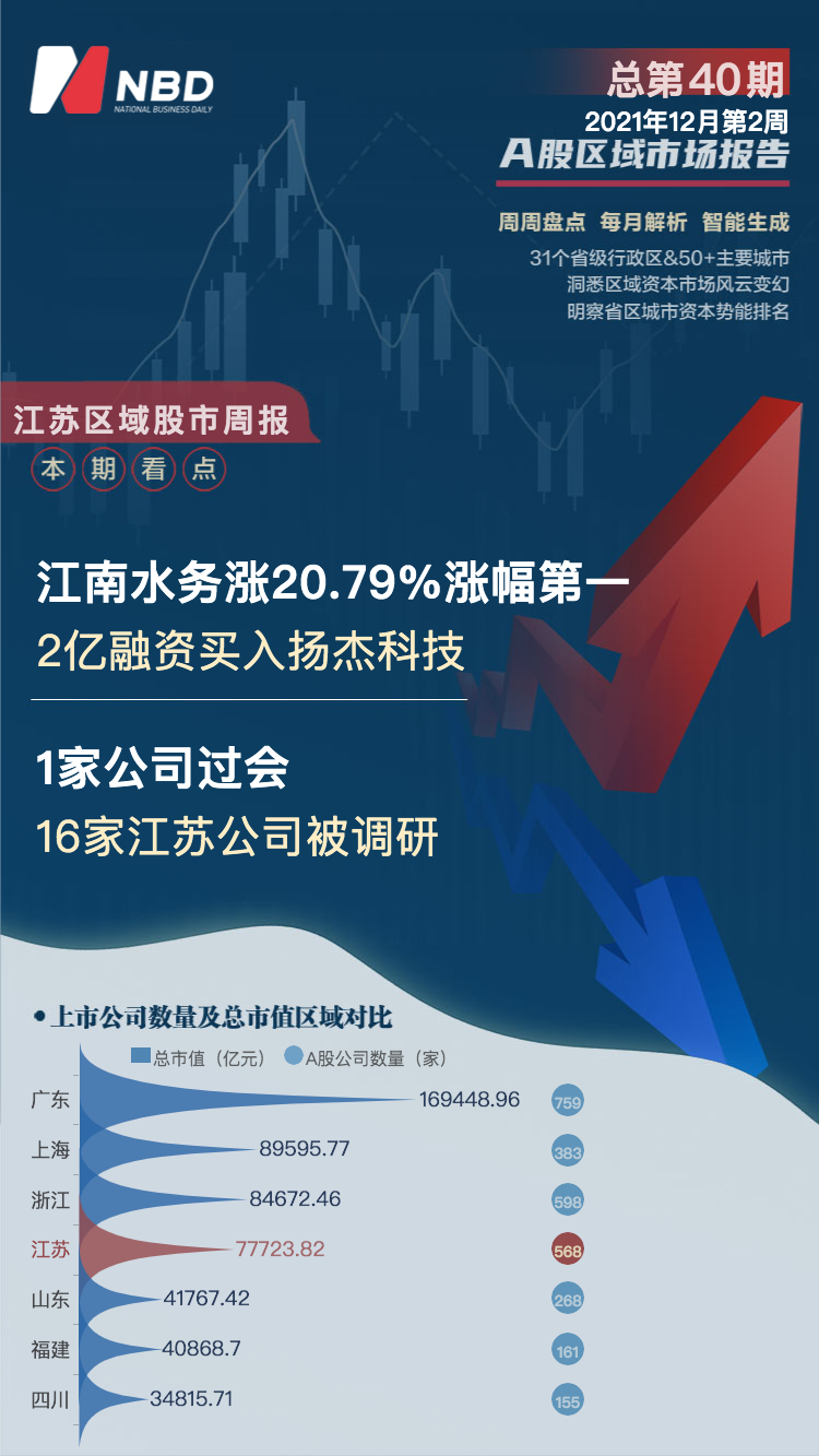 市值方面,截至2021年12月12日,江苏板块总市值为77723.82亿元,较前一周77602.55亿元,增长0.16%(加权平均)。