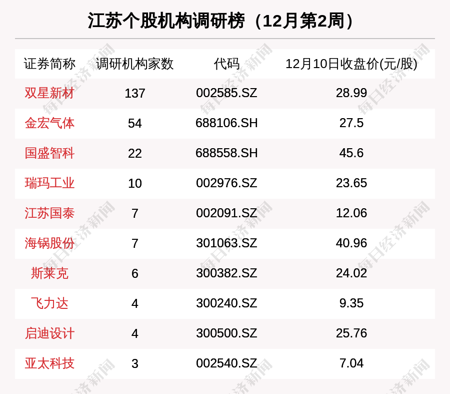 机构调研方面,据Wind统计,12月第2周,有16家江苏上市公司接受机构调研。其中,137家机构到访双星新材,54家机构到访金宏气体,22家机构到访国盛智科,10家机构到访瑞玛工业,7家机构到访江苏国泰。