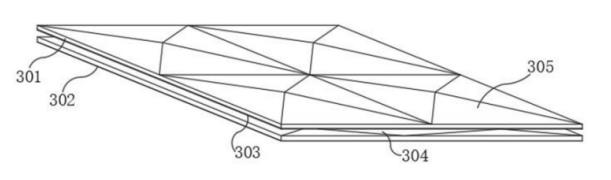 如上图,为分光膜主体的结构示意图,分光膜主体包括上层分光膜301、下层分光膜302、OCA胶303、下层分光结构304和上层分光结构305。下层分光结构位于下层分光膜的外表面,上层分光结构位于上层分光膜的外表面,OCA胶位于上层分光膜与下层分光膜之间。