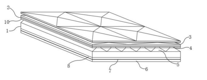一号粘胶层连接棱镜结构的位置设置有连接层4,棱镜膜的下端外表面固定连接有棱镜底部结构8,棱镜底部结构下端固定连接有复合膜6,棱镜底部结构与复合膜之间固定连接有二号粘胶层7。棱镜膜的上端通过一号粘胶层与扩散膜的下端外表面谷底连接,棱镜膜与棱镜结构、连接层之间一体成型。棱镜底部结构的下端通过二号粘胶层与复合膜的上端定位连接。