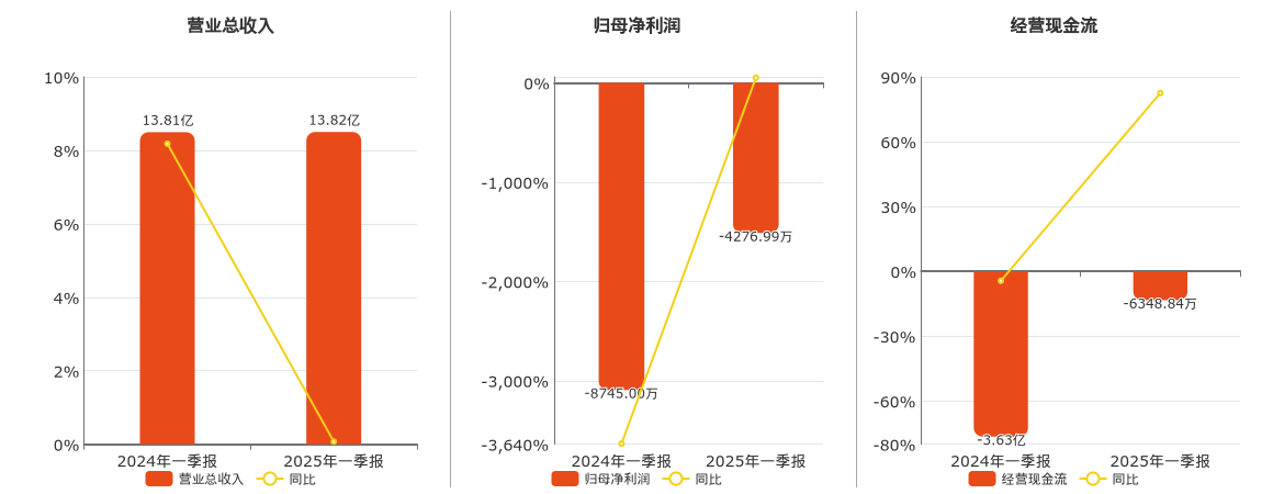 公司营业总收入为13.82亿元。归母净利润为-4276.99万元。经营活动现金净流入为-6348.84万元。