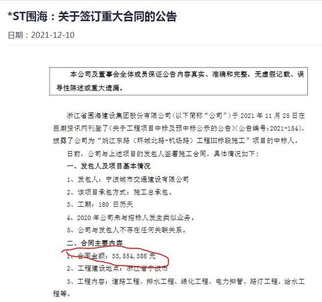 12月9日晚间,*ST围海再传喜讯。公司再度发布中标公告,中标合同金额为3355.44万元。