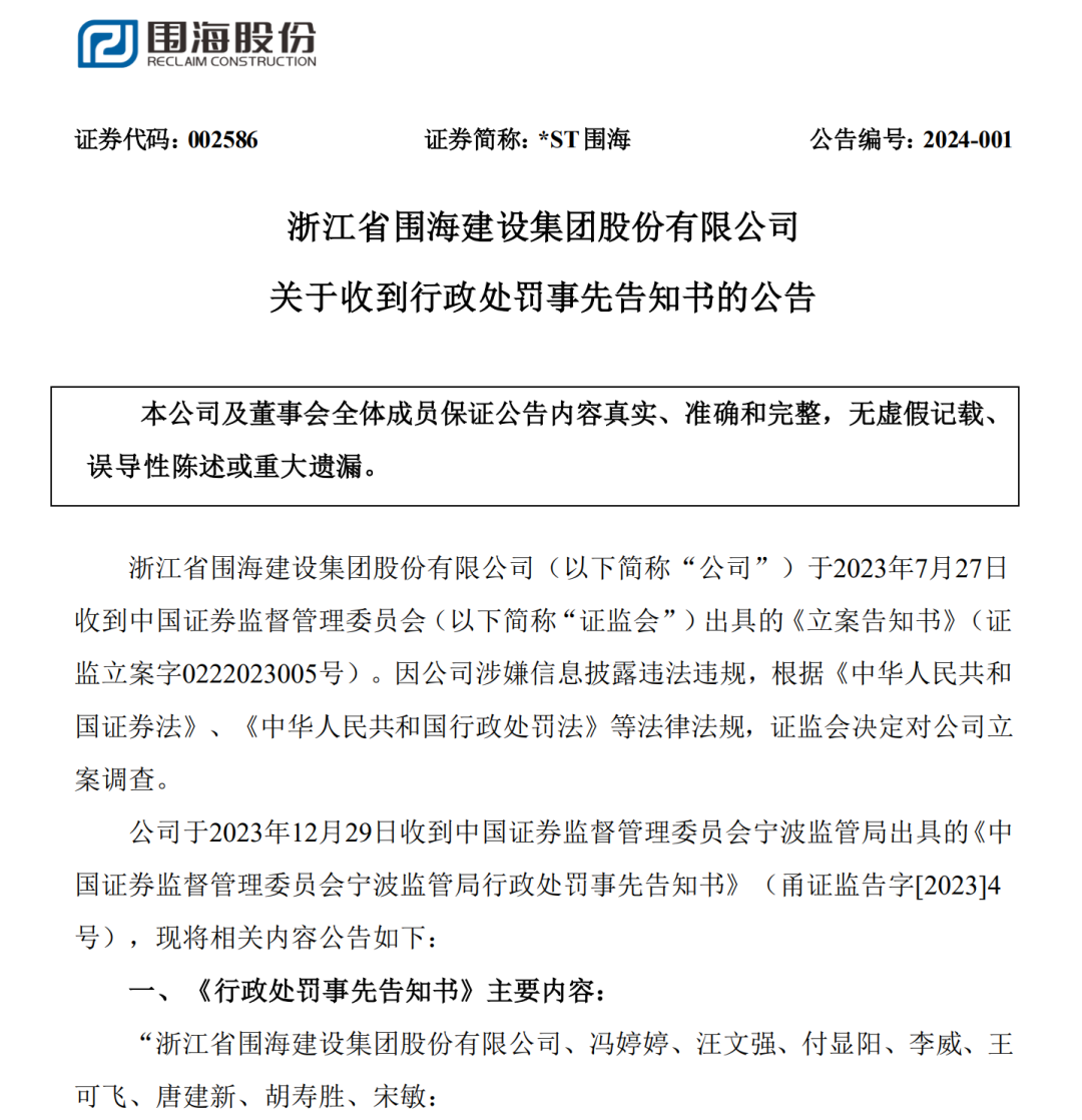 1月1日晚间,*ST围海公告,因涉嫌信息披露违法违规,2023年7月27日,证监会决定对公司立案调查。12月29日,*ST围海收到证监会宁波监管局出具的《行政处罚事先告知书》。