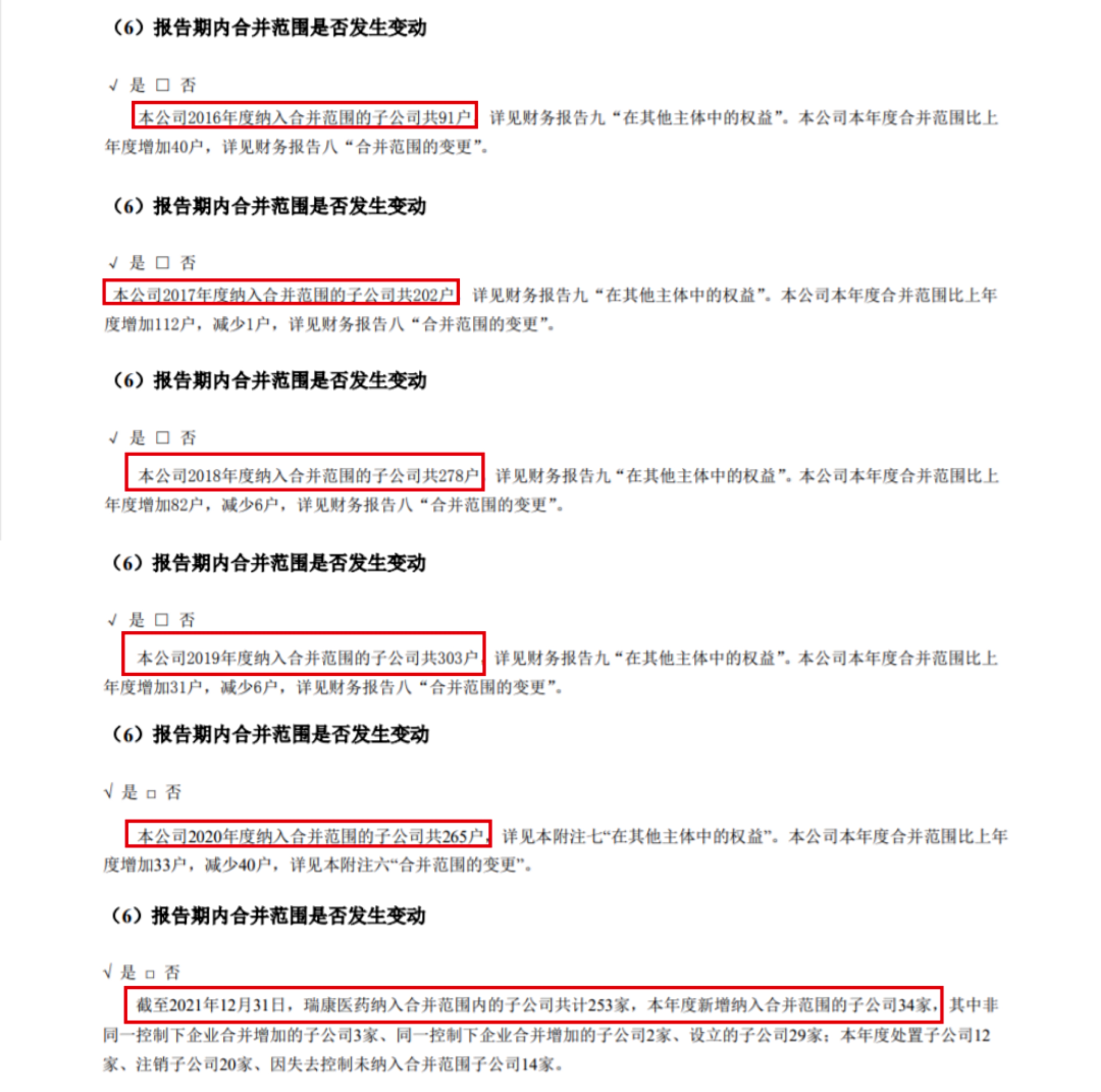 综合瑞康医药近几年年报,2016—2021年,瑞康医药纳入合并范围的子公司分别为91户、202户、278户、303户、265户、253户,公司归属净利润分别为5.908亿元、10.08亿元、7.712亿元、-9.278亿元、2.613亿元、1.312亿元。
