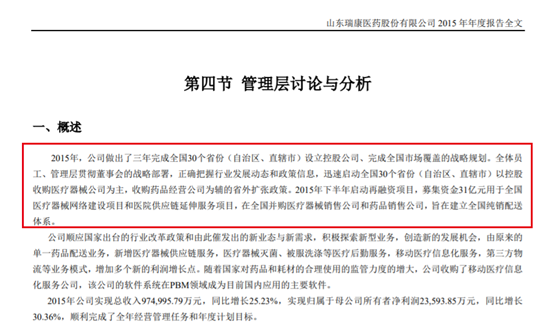 瑞康医药并购战略要从其全国布局说起。2015年,该公司做出“三年完成全国30个省份(自治区、直辖市)设立控股公司、完成全国市场覆盖”的战略规划。当年下半年,其募集资金31亿元用于全国医疗器械网络建设项目和医院供应链延伸服务项目,在全国并购医疗器械销售公司和药品销售公司。自2015年实现全国布局以来,以“并购+合伙人”为主要手段,瑞康医药持续扩大规模,子公司更是从几十余家扩张到2019年的300余家。