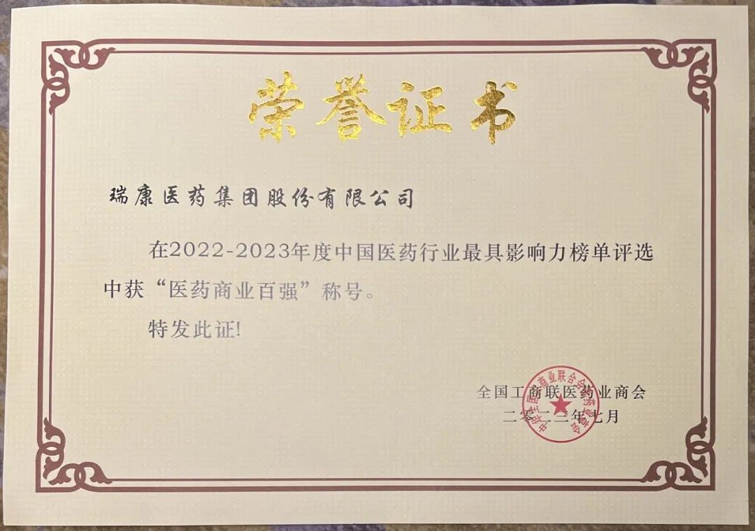 此次会议期间隆重发布了“2022-2023年度中国医药行业最具影响力榜单”,瑞康医药集团股份有限公司荣膺“医药商业百强企业”、“守法诚信企业”两项殊荣!