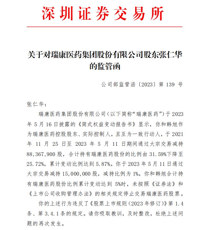 监管函显示,瑞康医药集团股份有限公司(以下简称“瑞康医药”)于2023年5月16日披露的《简式权益变动报告书》显示,张仁华和韩旭作为瑞康医药控股股东、实际控制人,且互为一致行动人,于2021年11月25日至2023年5月11日期间通过大宗交易减持88367900股,合计持有瑞康医药股份的比例由31.59%下降至25.72%,累计变动比例达到5.87%。