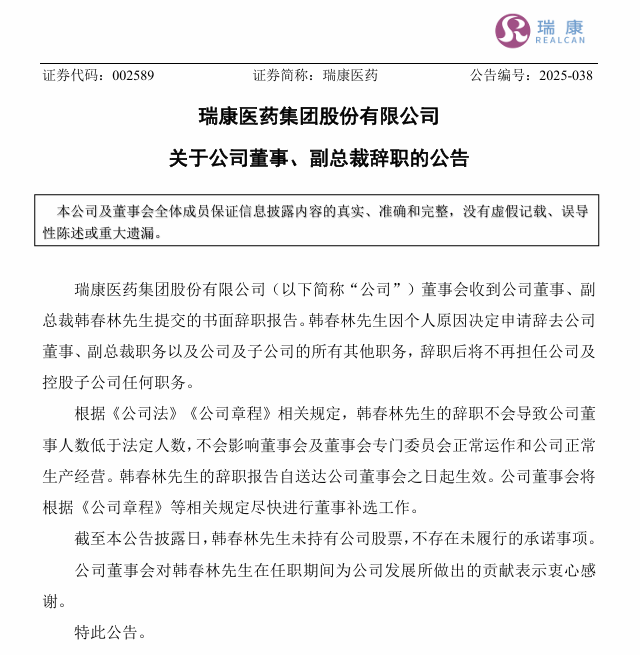 瑞康医药集团股份有限公司(以下简称“瑞康医药”)发布公告宣布,公司董事、副总裁韩春林因个人原因决定申请辞去公司董事、副总裁职务以及公司及子公司的所有其他职务,辞职后将不再担任公司及控股子公司任何职务。韩春林系瑞康医药实际控制人韩旭、张仁华之子。