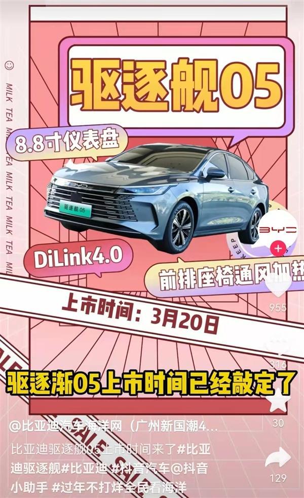 近日,ID昵称为@比亚迪汽车海洋网(广州新国潮4S店)的认证用户,在某音发布了驱逐舰05的上市定档时间:3月20日。