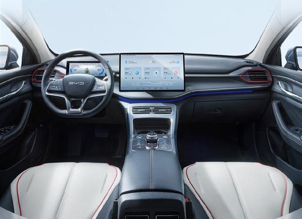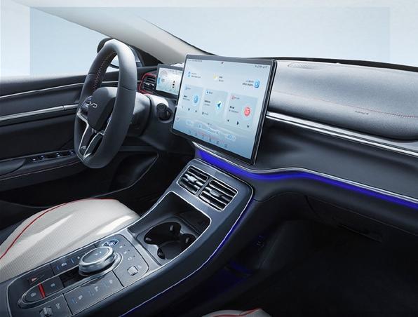 内饰来看,驱逐舰05采用“两大一小”创新组合,配备一块8.8英寸全液晶仪表盘,以及一块15.6英寸自适应悬浮Pad,配合小巧精致的旋钮式换挡按钮,有效提升了车内的科技感和精致属性。