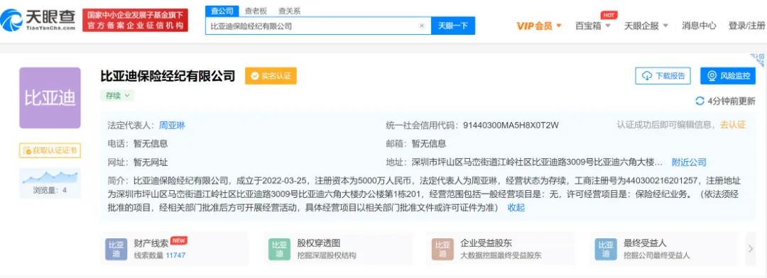 天眼查信息显示,3月25日,比亚迪保险经纪有限公司在深圳成立,注册资本5000万元人民币,该公司由比亚迪汽车工业有限公司全资控股。