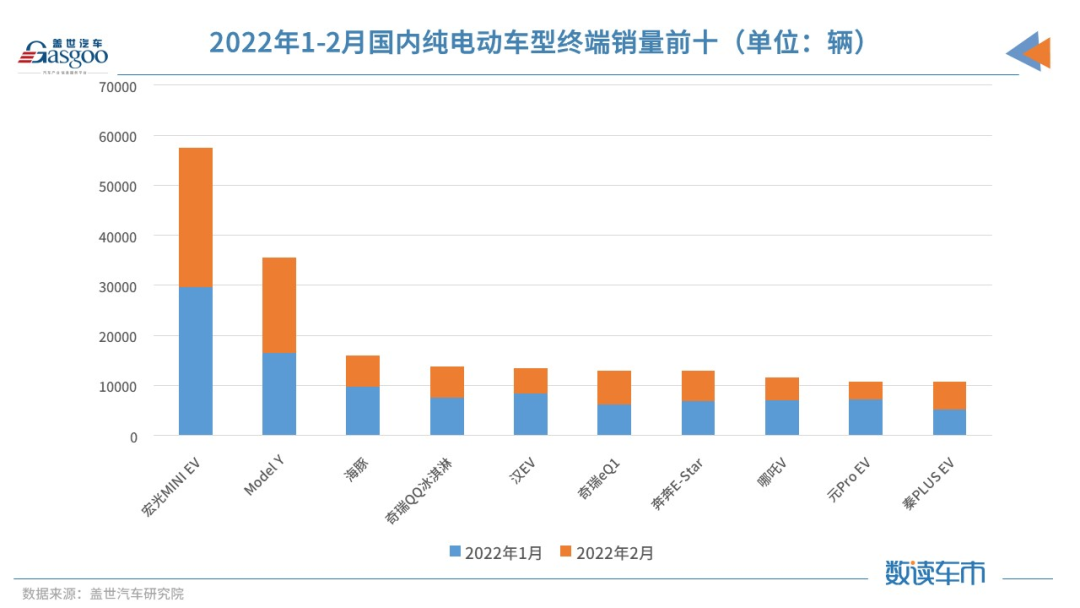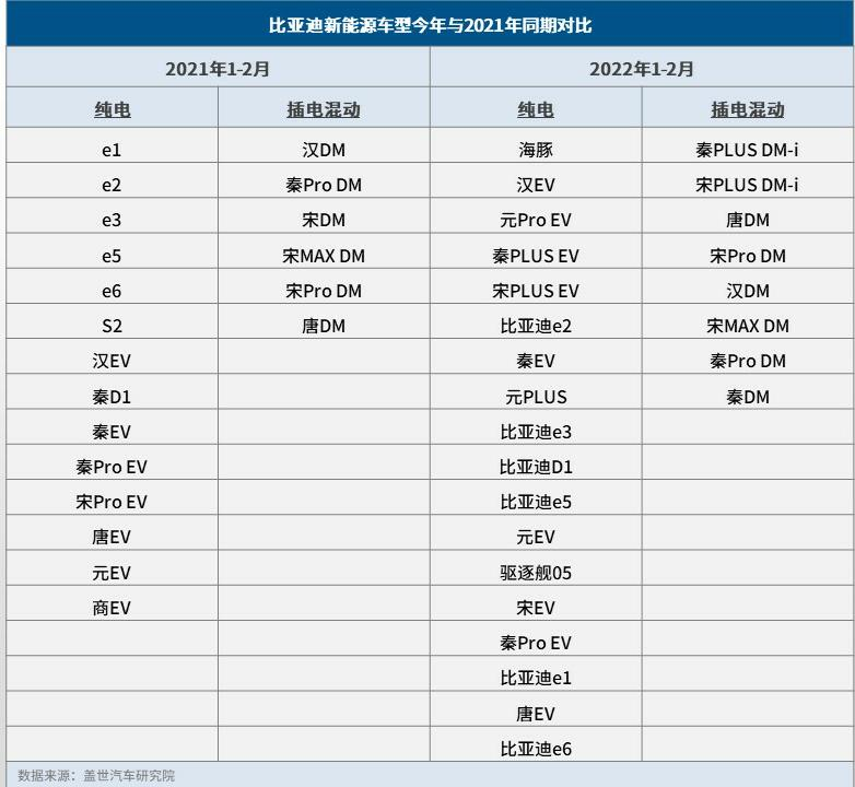 究其原因,数据上最直观的是比亚迪今年在售的新能源汽车数量增多。去年同期,比亚迪有终端销售数据的纯电动车主要是e系列、汉EV、秦EV、宋Pro EV、元EV等共14款,而从今年前两月看,比亚迪纯电动新增海豚、秦PLUS EV、宋PLUS EV等车型,有终端销售数据的纯电动车型共有18款。