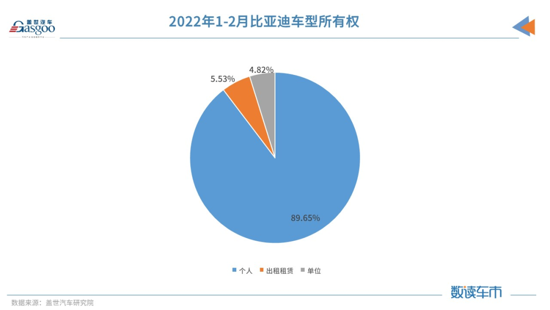 据终端销量数据,按所有权分类,比亚迪个人用户今年前两月销量约为13.9万辆,占比89.65%,而这一比例已经高于新能源整体市场的个人用户占比水平。相对之下,比亚迪出租租赁和单位用户终端销量占比并不大,分别为5.53%和4.82%,其中前两月出租租赁销量为8579辆,单位销量为7482辆。
